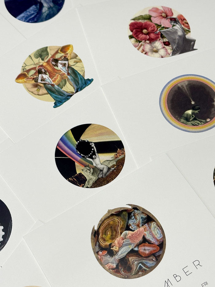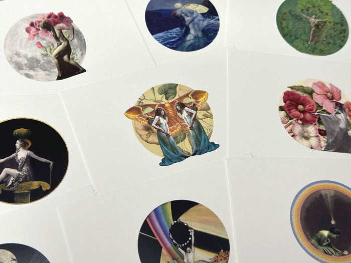 EACH CARD features a different collage by MM. Please note subtle variations in texture, softness and sharpness, shadow and light are all part of the creative expression of MM's collage work which is intentional and particular to each piece.